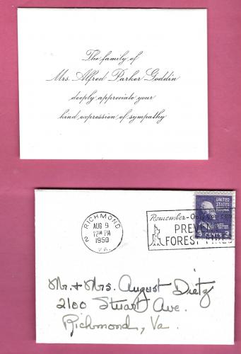 Hear is a cover of August Dietz, I won his mail at auction, He is a Philatelic expert in Confederate covers and stamps and wrote books on them. U.S. Scott 807 Richmond Aug9 1950 logo cancel. I will add to this section daily.
