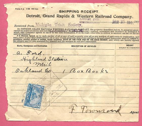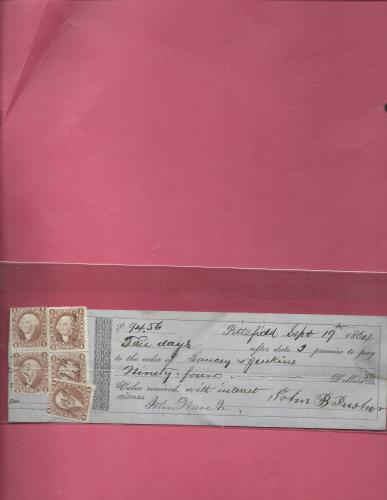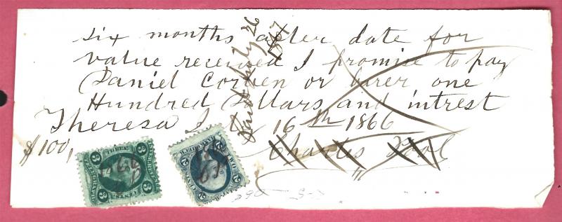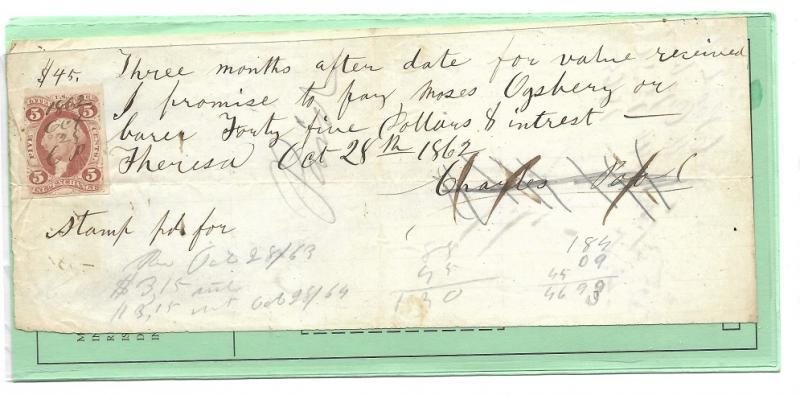 Shipping Receipt. Detroit, Grand Rapids & Western Railroad Company Jan 15 1901.Blue 1 cent Document Stamp was used R 163. Below I posted a news article the Internal Revenue put out to let the companies and post offices when the revenue stamps would be for sale. If you collect them and research Revenue stamps you know why it was so important to be able to use these stamps on all receipts, checks, loans, Mortgage papers, even pictures. The revenue law was you would be fined $50 for each one of these articles you did not put a revenue stamp on. When I was researching the promissory note from Theresa New York 1862, The release date in the news clipping was important. It was Sept 17, 1862. The stamps were kept in a vault until that date. My note is dated Oct 28 1862. So It was possible the 5 cent stamp was used on that date. I also found micro film sales records from Theresa on that date with Mr. Charles Poole on it with a 5 cent purchase.. The Micro film records were supplied by The Smithsonian institution.