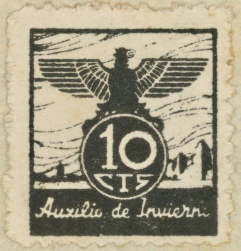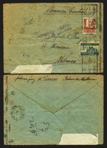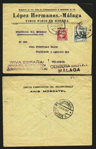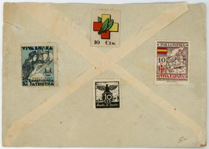 Before dispatch, a number of Nationalist cachets / hand-stamps, and cinderellas were appliled. It then passed through military censorship at Pontevedra.