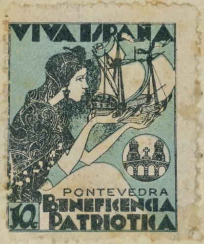 Pontevedra SG 36 (issued July 18, 1937). This was a local overprint of ¡ARRIBA ESPAÑA! / PONTEVEDRA / 18 Julio 1937 / II Another Triunfal on a 30 cts carmine SG755.