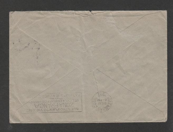 There is no airmail etiquette, no indication of registration or other kind of special handling. So, it would appear to have travelled by surface mail. In 1937 Spain joined the Unión Postal de las Américas y España (UPAE). Outbound letters from the Nationalist Zone to UPAE countries would have been sent at the same rate as domestic mail. After March 17, 1937 that rate would have been 30 céntimos. Assuming there was only one stamp on the original cover (suggested by the size of the torn corner, IMO) we are, therefore, looking for a 30 cts stamp which would have been used in Pontevedra under Nationalist control. The date window of the cinderella stamps on the back suggest that it was mailed in 1937 or possibly 1938.