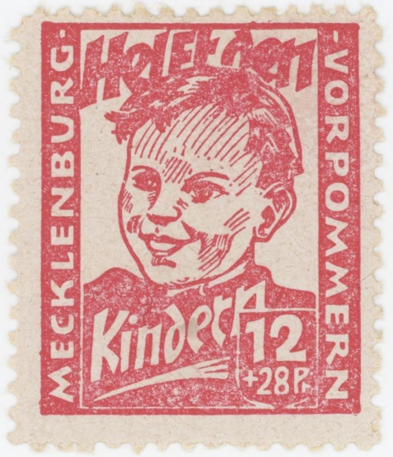 There is something I find arresting about these three stamps. Their simplicity, I suppose? Or, the Naïve Art style of the designer? As semi-postals in Soviet Occupied Meckenburg / Vorpommen in 1945 raising money for child welfare the images would seem very appropriate to the task and very reflective of the state of the economy.